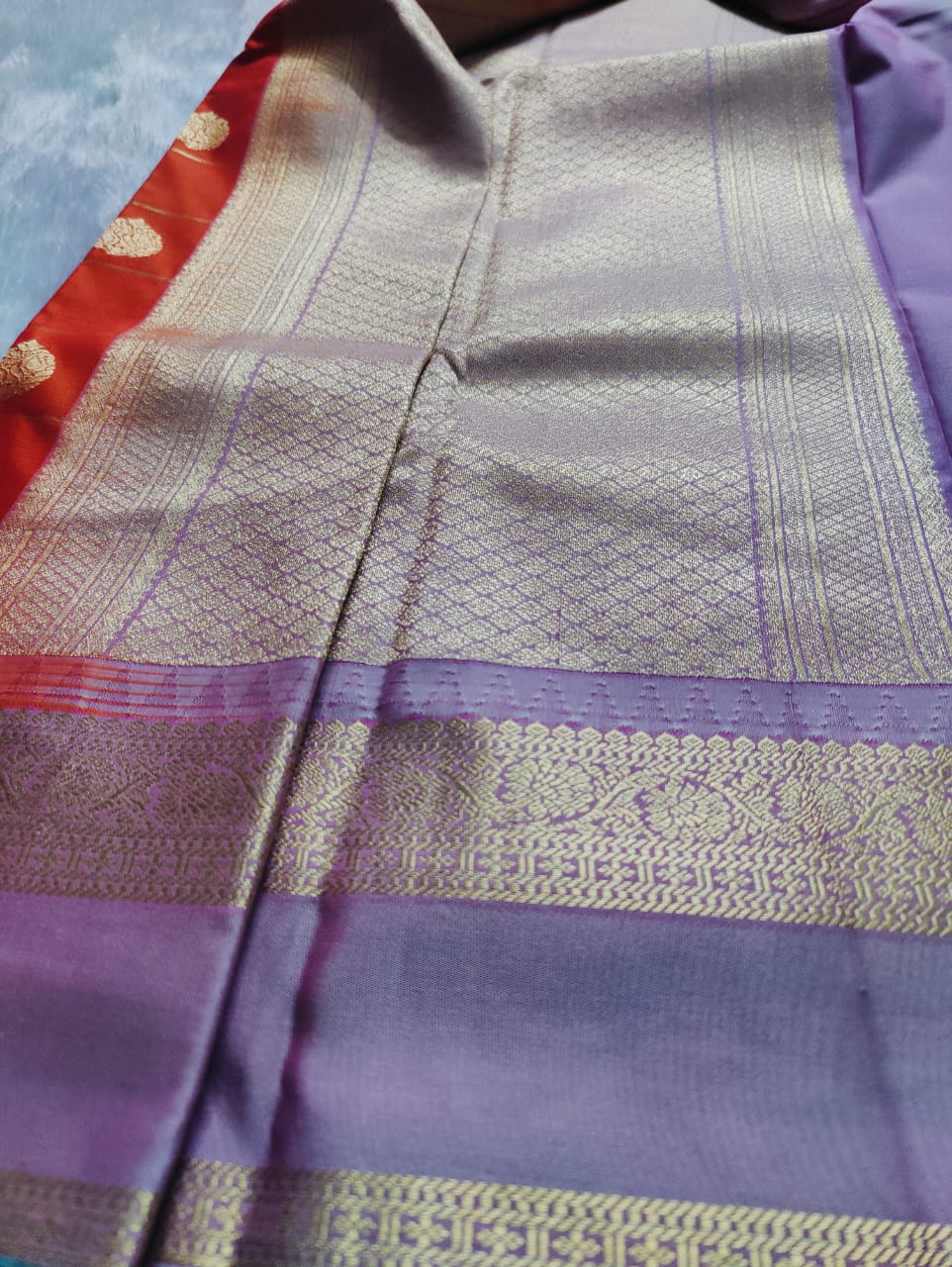 - Soft pink-mauve border and pallu with rich gold zari work